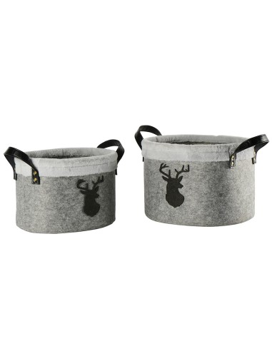 Set de 2 corbeilles ovales en feutrine grise motif tête de cerf feutrine grise bordure peluche grise 100% polyester 32x23x26 cm / 36x26x30 cm 2 anses Pu noir avec rivets laiton
