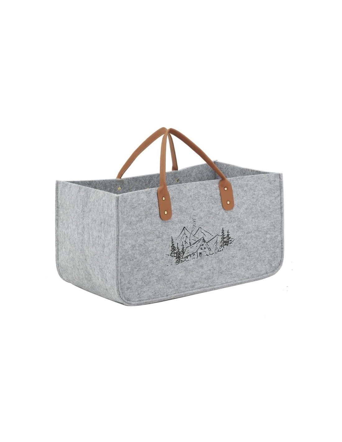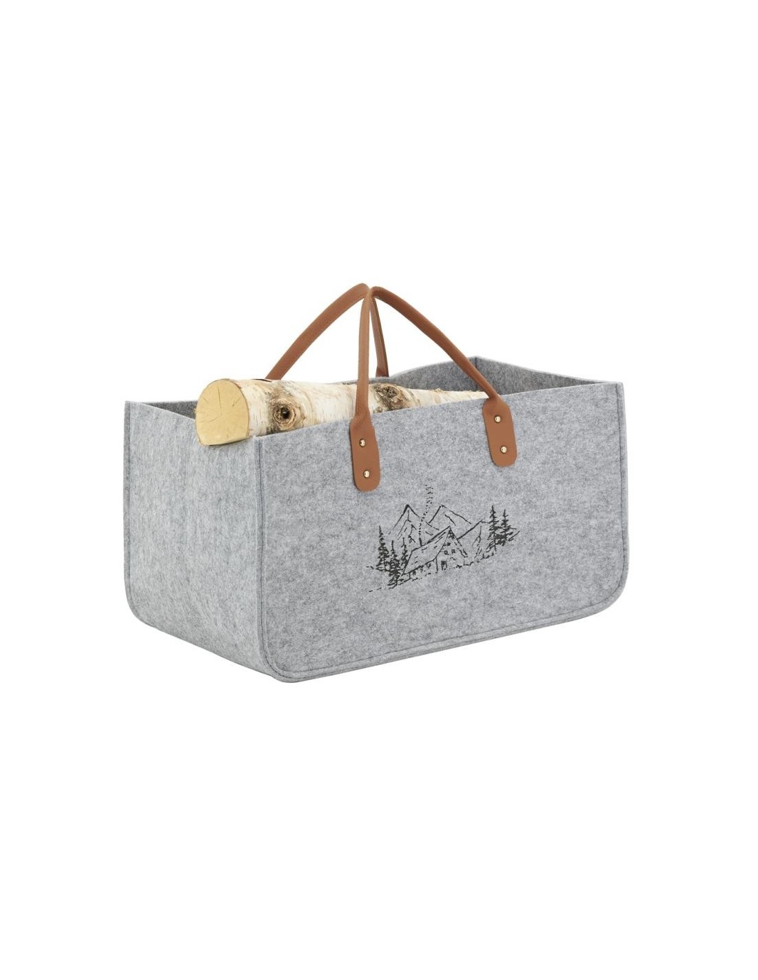 Sac à bûches en feutrine grise, décor montagne. 2 anses en PVC.