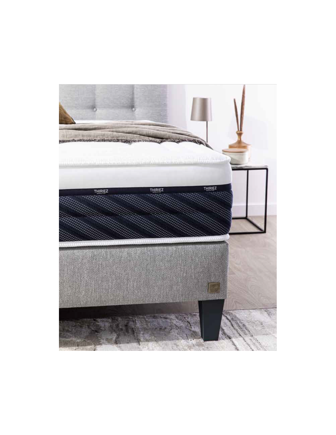 - Suspension de 1053* ressorts ensachés, 7 zones de confort, associée à une ceinture périmétrale haute densité pour plus de stabilité.