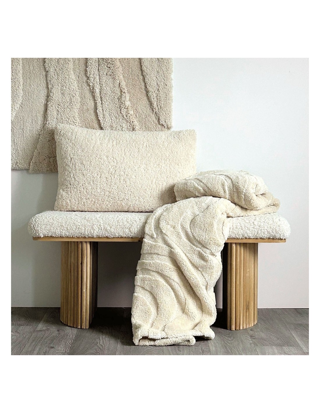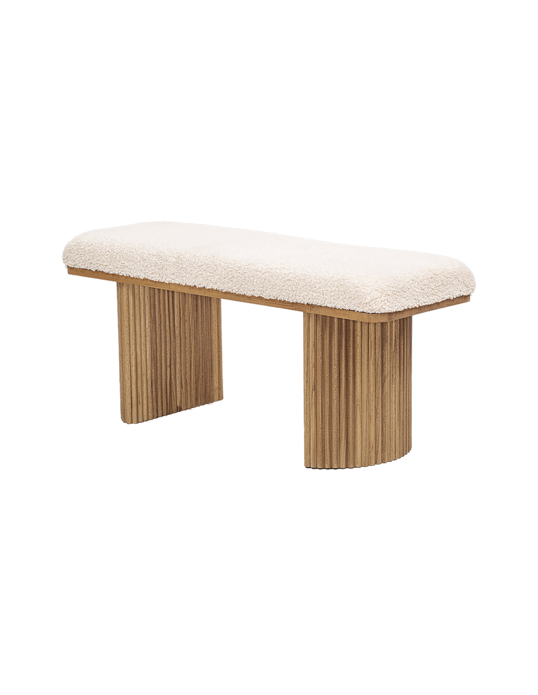 Banc fonctionnel et minimaliste combine une assise en tissu bouclé blanc, doux et confortable, avec des pieds en fines baguettes de bois, à la fois légers et stables.